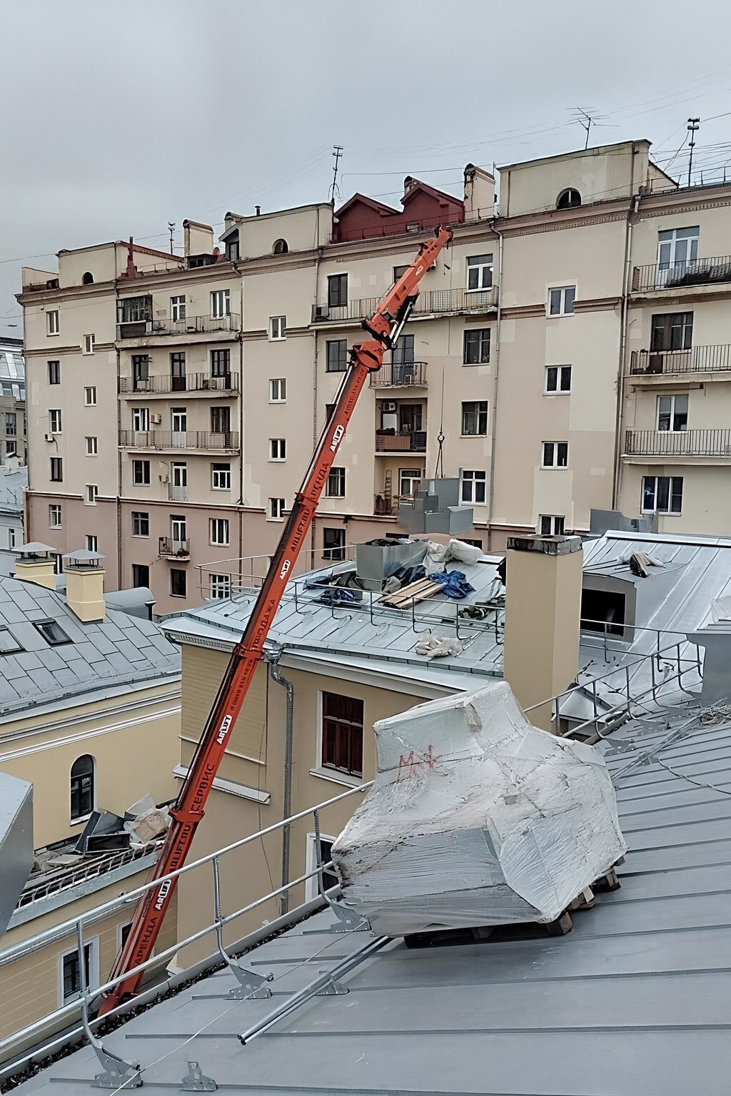 Мы привезли технику на объект, без сложностей заехали во двор и на аутригерах установили близко к зданию, но в безопасной зоне от балконов, труб и деревьев. Проезд оставили свободным, чтобы жильцы могли заезжать и выезжать из дома. Оператор управлял подъемом грузов с земли, монтажники принимали на крыше. Работали на дизеле, чтобы не тянуть кабели через весь двор и не искать розетки.