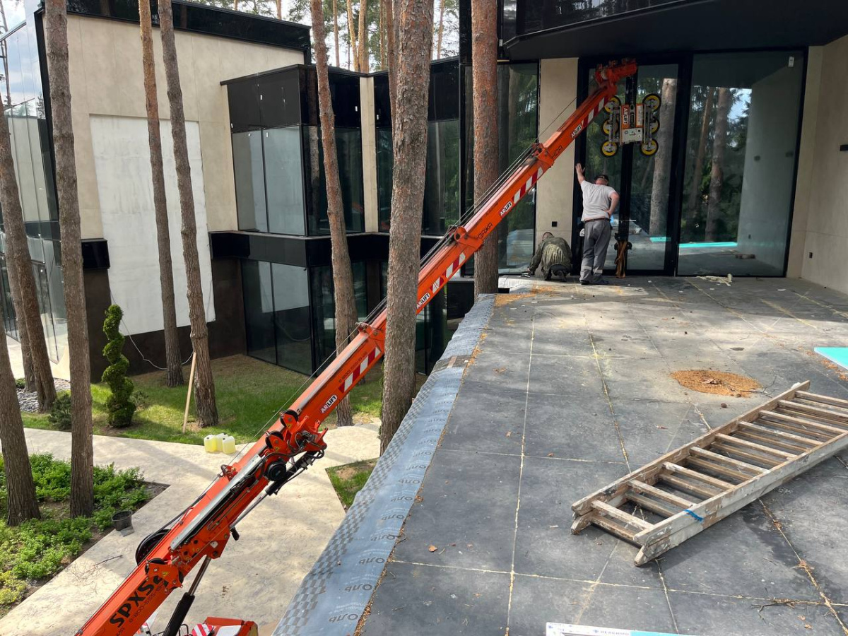 Остекление под козырек с помощью мини-крана Арлифт