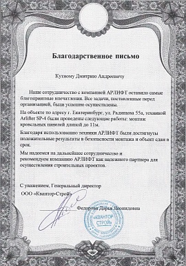 Благодарственное письмо от ООО "ПСК Алюпласт"